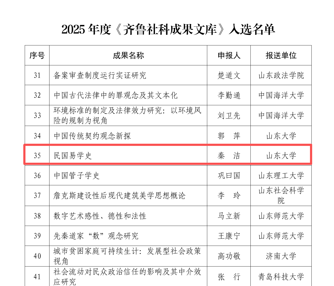 近日,山东省哲学与社会科学工作办公室公布了2025年度《齐鲁社科成果文库》入选名单,共有53项成果进入名单。山东大学易学与中国古代哲学研究中心秦洁副教授《民国易学史》成功入选。