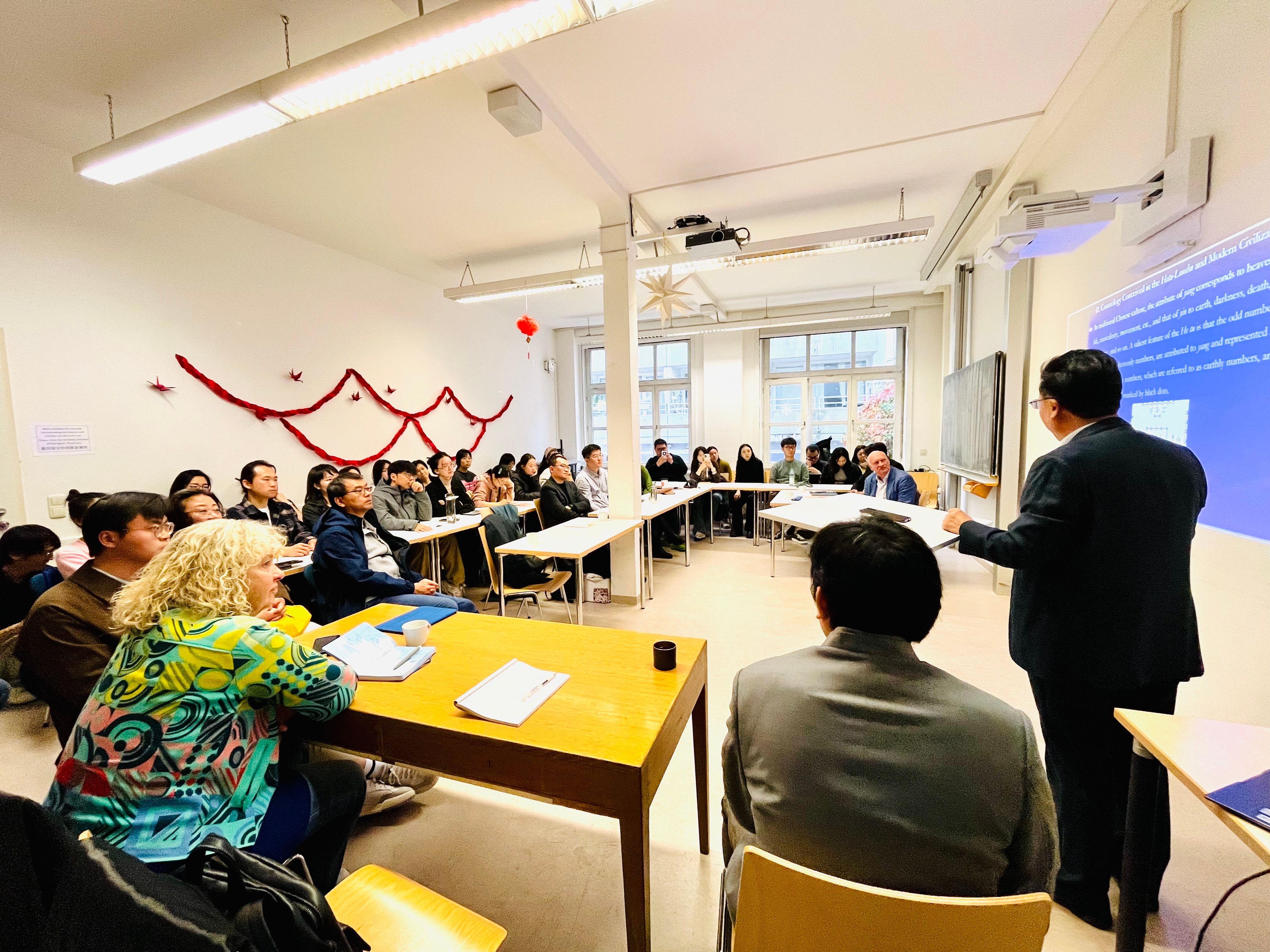 在慕尼黑访问期间,代表团成员为慕尼黑大学汉学系的师生及该校其它系的中国文化爱好者奉献了四场学术讲座。这四场讲座的主题分别是:“从‘元’‘亨’‘利’‘贞’解读《周易》哲学”“《周易》与现代文明”“《周易》象思维的逻辑”以及“《论语》中的孔门弟子形象比较”。讲座由叶翰教授和鲍吾刚教授的弟子Dominique Hertzer教授主持,受到与会学者与学生的一致好评,为双方的进一步交流与合作奠定了基础。此外,代表团还应邀访问了山东省政府驻欧洲经贸代表处,与代表处首席代表于雷、巴伐利亚-山东经贸交流促进会秘书长唐彦、德国山东商会巴伐利亚分会会长张昊等德国商贸界人士进行了深入的交流。代表团向当地华裔社区介绍了学校近年来在文明互鉴和文化传播方面所采取的一系列措施及其成效,并就进一步加强中德文化合作提出了若干建议。