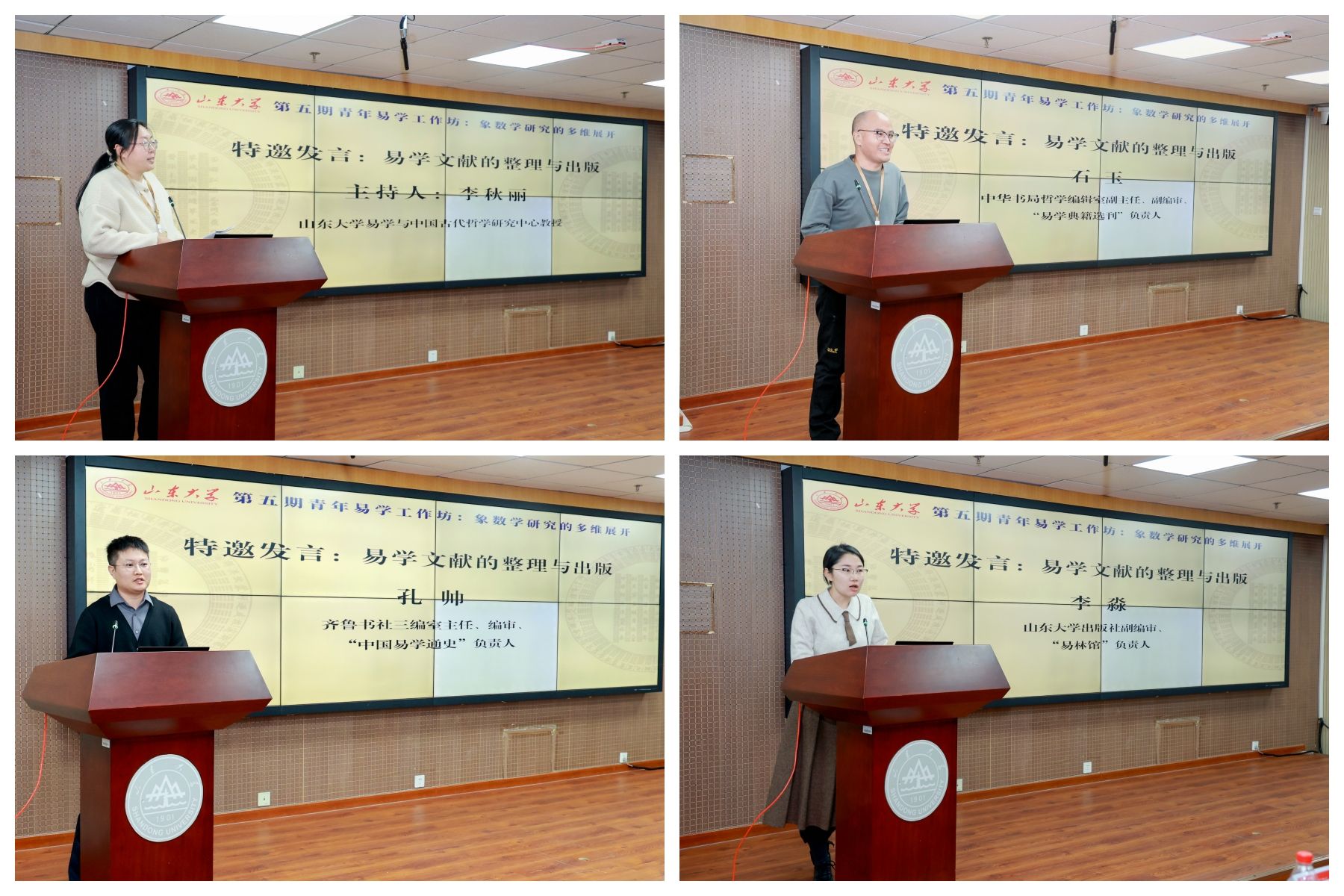 主题讨论环节后,大会进行了题为“易学文献的整理与出版”的第二场特邀发言。中华书局哲学编辑室副主任、副编审、“易学典籍选刊”负责人石玉,齐鲁书社三编室主任、编审、“中国易学通史”负责人孔帅,山东大学出版社副编审、“易林馆”负责人李淼分别介绍了所在出版单位于易学文献出版方面的成果以及未来的工作计划。本场特邀发言由山东大学易学与中国古代哲学研究中心教授李秋丽主持。