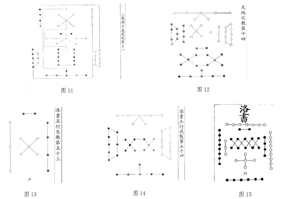 不仅两仪四数合配中五得到六、七、八、九四象数,而且五生数全方位与天五合配则得到五成数,即地六、天七、地八、天九、地十。天一、地二、天三、地四、天五、地六、天七、地八、天九、地十,刘牧称之为天地之极数,其总和为五十五,书中有图《二仪得十成变化第十一》(图11),并解释说:“此乃五行生成数,本属《洛书》。此画之者,欲备天地五十五之数也。”(《易数钩隐图》,第247页)又有图《天地之数第十四》(图12),且解之说:“内十五,天地之用九、六之数也。兼五行之数四十,合而为五十有五,备天地之数也。”(《易数钩隐图》,第248页)可见这两幅十数图是《洛书》的体现,可视之为《洛书》图式系列。而《洛书》本图则体现为两个部分,一是五行生数图(图13),一是五行成数图(图14)。实际上,《易数钩隐图》中并没有将五行生数与成数合而为一的《洛书》。反倒是李觏在《删定易图论》中将二者合而为一(图15)(《李觏集》,第53页)。刘牧没这样做,也是有其用意和心思的。