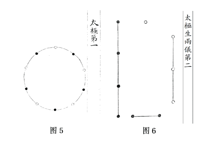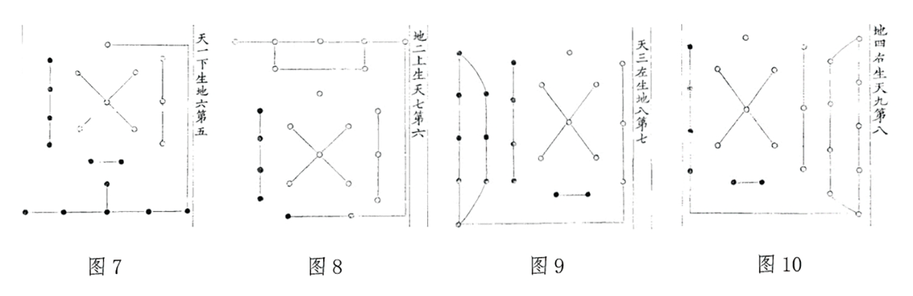 刘牧说:“太极者,一气也。天地未分之前,元气混而为一,一气所判是曰两仪。”(《易数钩隐图》,第242页)作为混一之元气,太极无数无象,其所画圆形上有黑白相间之十数点的太极图(图5),不过是借两仪之气混一之象来表太极而已,而就太极而言并无阴阳之分。太极分判为两仪,“两仪乃天地之象,天地乃两仪之体”(《易数钩隐图》,第242页),两仪是天地之象,并不就是天地本身,以数表示则是天一、地二、天三、地四(图6)。在两仪生四象的过程中,天五发挥了关键的作用。天五居中而主变化,“不知何物也,强名曰中和之气,不知所以然而然也。交接乎天地之气,成就乎五行之质,弥纶错综,无所不周”(《易数钩隐图》,第243页)。也就是说在两仪四数之外,又有作为生化之原动力的中和之气,其数为五。一二三四与五构成五生数,刘牧又称之为“天地之数”,有图《天地数十五第四》,与上文已言之《河图天地数第五十》(图2)完全一样。天地五生数既已具足,则按照“参伍以变,错综其数”的方式,生成地六、天七、地八、天九之数。刘牧说:“参,合也。伍,为配偶也。为天五合配天一下生地六之类是也。”(《易数钩隐图》,第244页)即天五配合天一下生地六(图7)、天五配合地二上生天七(图8)、天五配合天三左生天八(图9)、天五配合地四右生天九(图10),此即为“四象”,合之则为《两仪生四象第九》,与上文已言之《河图四象第五十一》(图3)完全一样。